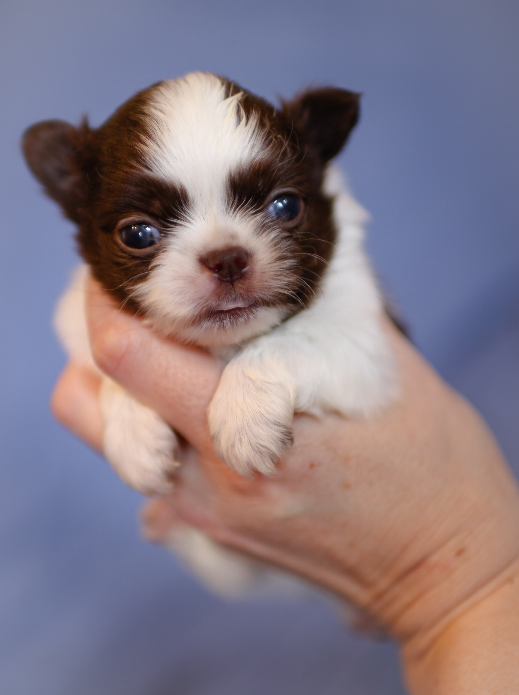 Мальчик чихуахуа длинношерстный, бело-шоколадного окраса, миник, с коротким хвостиком. Документы РКФ (клеймо), ветпаспорт. Продается как домашний любимец.