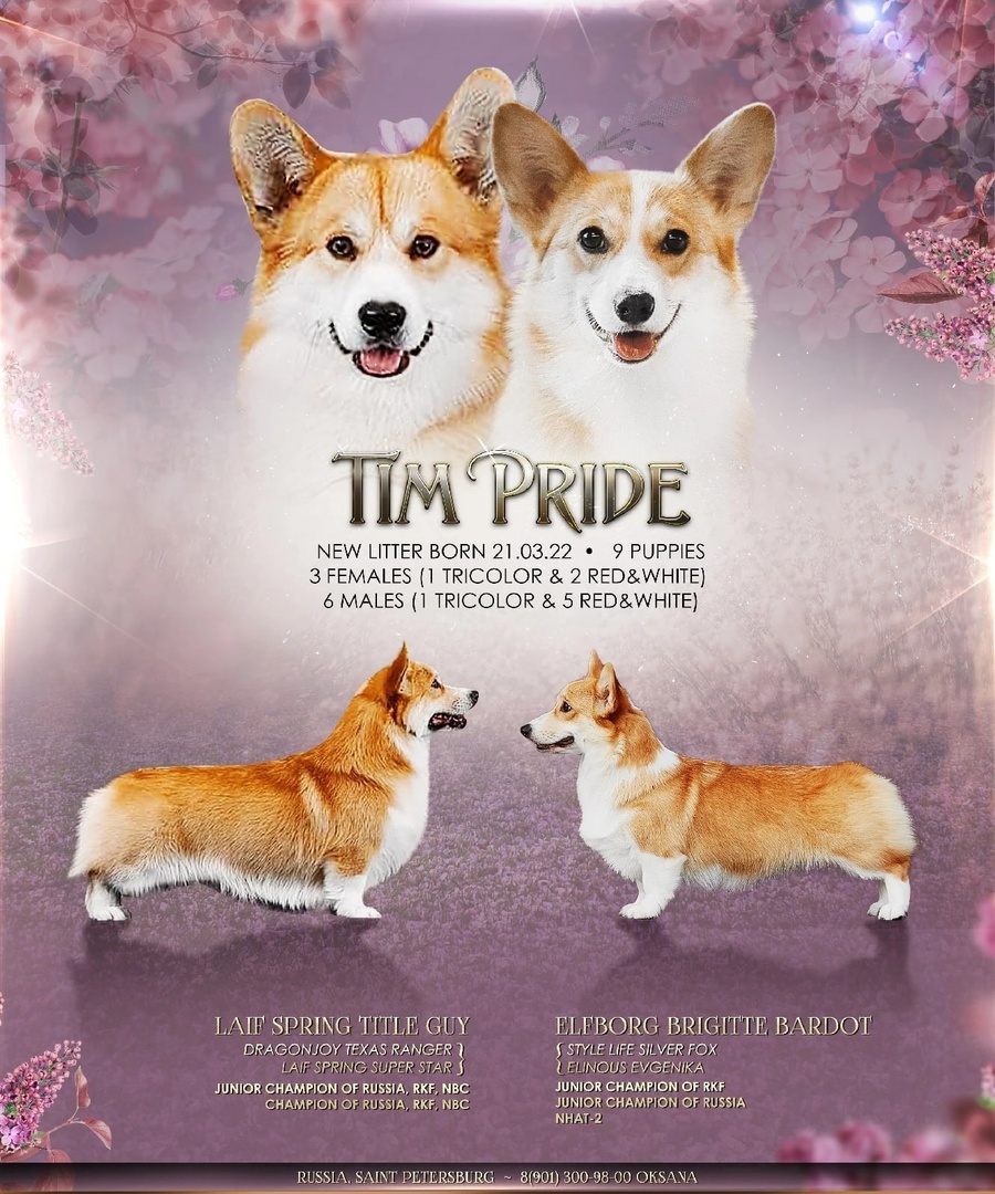 Kennel ТIM PRIDE💕 Санкт-Петербург. Щенки вельш корги пемброка. Девочки само очарование 💃 Очень умные, смышленые, контактные. Любят играть, целовашки и обнимашки❤ Готовы и в пир💮 и в мир💮. Хоть на выставку🏆 хоть в поход🐕🦺. Только бы быть рядом с любимым хозяином🤩 Прекрасное происхождение и психика в приданое. Одно удовольствие общаться с такими щенками. 3 суки (2 триколор, 1 рыже-белая) Отец 💥LAIF SPRING TITLE GUY💥 ЮЧР, ЮЧРКФ, ЮЧНКП, ЧР, ЧРКФ, ЧНКП. Мать: ELFBORG BRIGITTE BARDOT ( Style Life Silver Fox *ELINOUS EVGENIKA ) Чемпион России, Юный Чемпион РКФ. ТПИ2 Щенки с документами РКФ, полностью привиты, начали социализацию ,имеют клеймо, ветпаспорт, договор. Подарки и скидки на корма , помощь питомника по Всем вопросам.